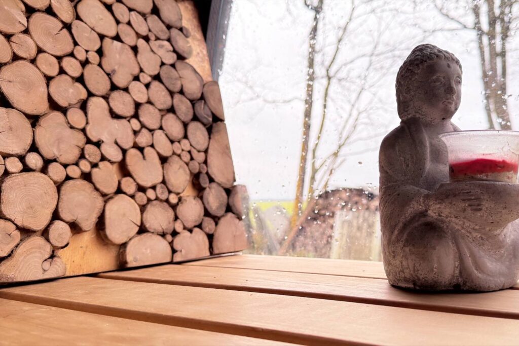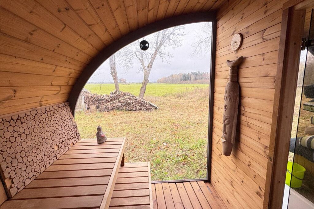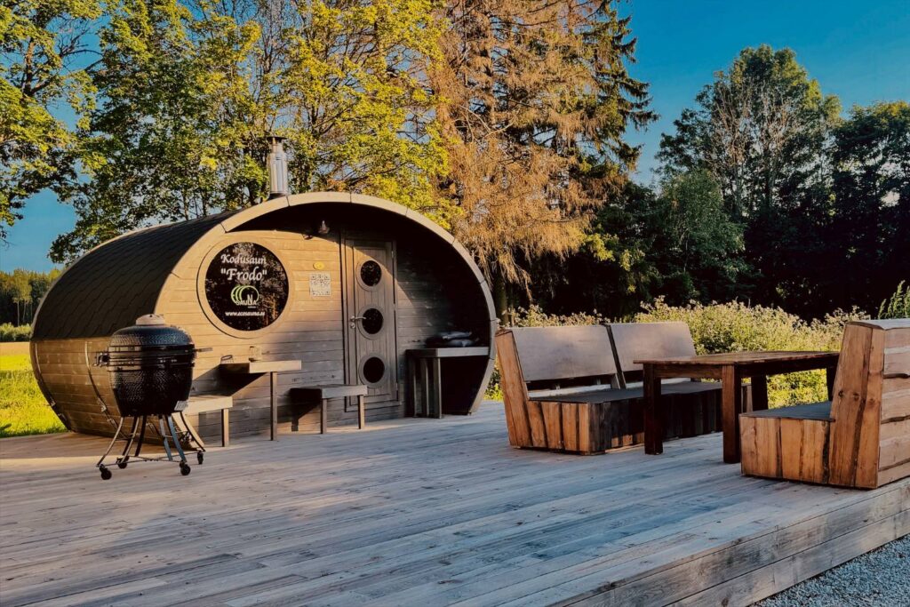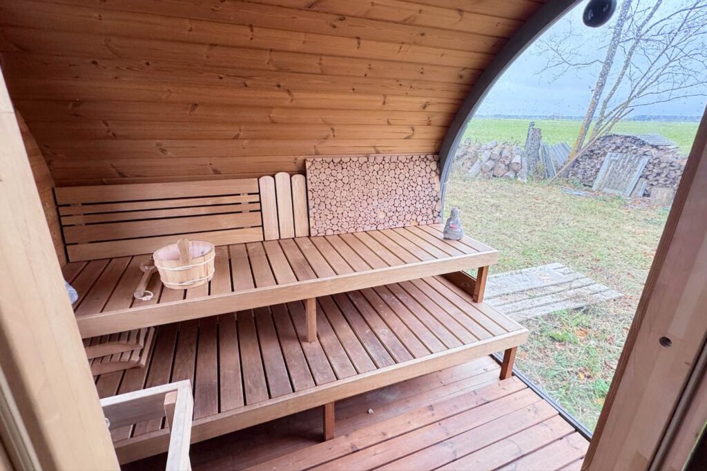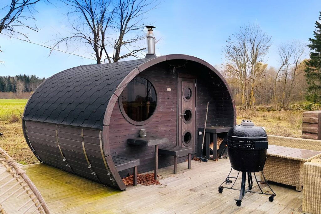 Piltidel on näha stiilne tünnisauna-tüüpi puuküttega saun, mille ümbrus ja detailid loovad rahuliku ning hubase atmosfääri.